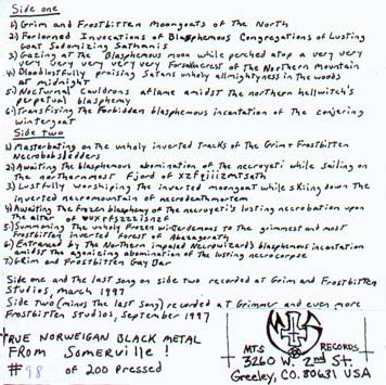 Side one recorded in March 1997 at Grim And Frostbitten Studios, Side two